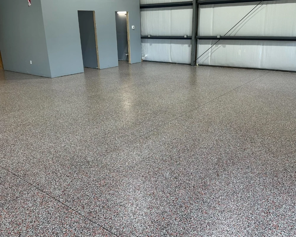 Custom Appearance, Professional Finish: Whether you’re designing a retail space or refreshing a garage, the coating can be tailored in color, flake size, and texture for a polished, professional result.